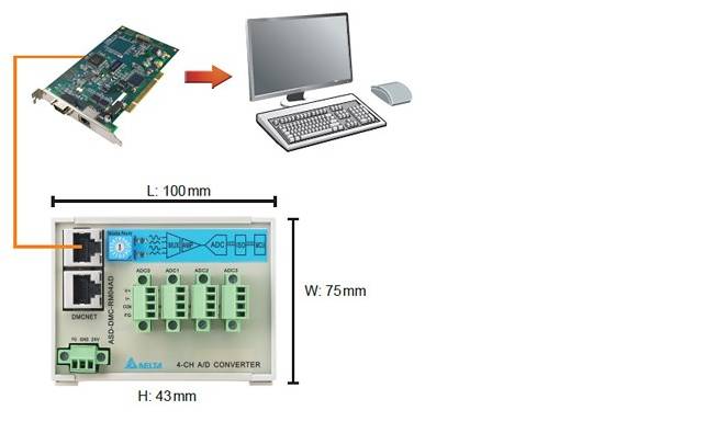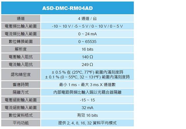 DMCNET 4 通道模擬輸入模塊 - ASD-DMC-RM04AD 分布式遠程模擬輸入擴展模塊,可提供 DMCNET 主站的主機遠程控制模擬信號
