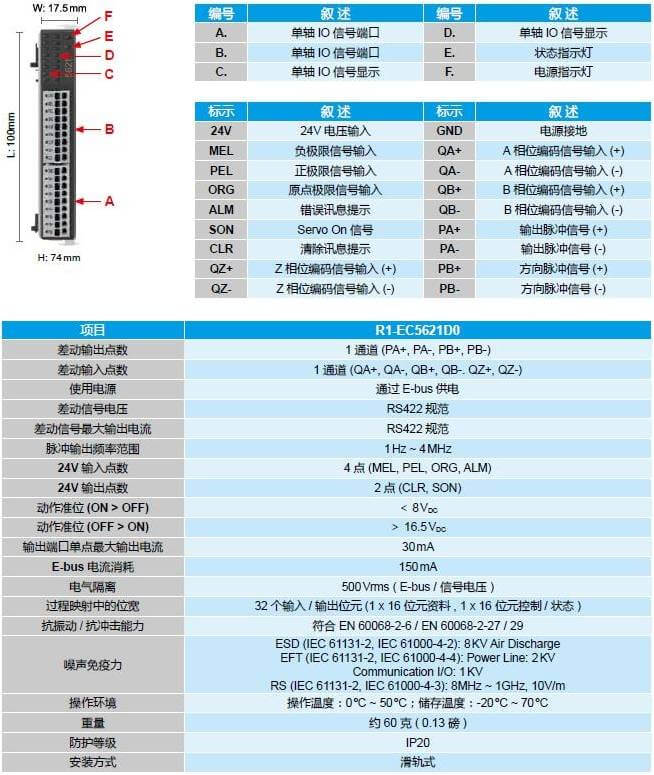 EtherCAT 單軸脈沖接口模塊 - R1-EC5621D0 單軸脈沖接口模塊,搭配 E-BUS 電源模塊可提供 EtherCAT 主站遠程控制單軸脈沖的運動